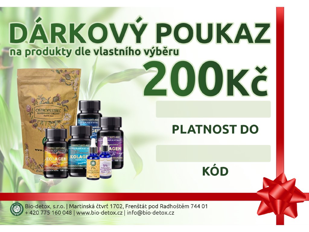 Nevíte čím obdarovat Vaše nejbližší, ale víte, že se starají o své tělo, krásu a zdraví? Dárkový poukaz od Bio-detoxu je přesně pro Vás to správné řešení. U nás si vybere každý !!! V nabídce máme nepřeberné množství vitamínů, doplňků stravy i zdravých pochutin. Vybere si zkrátka každý !!! V jaké hodnotě poukázka bude, záleží už jen a jen na Vás :-)