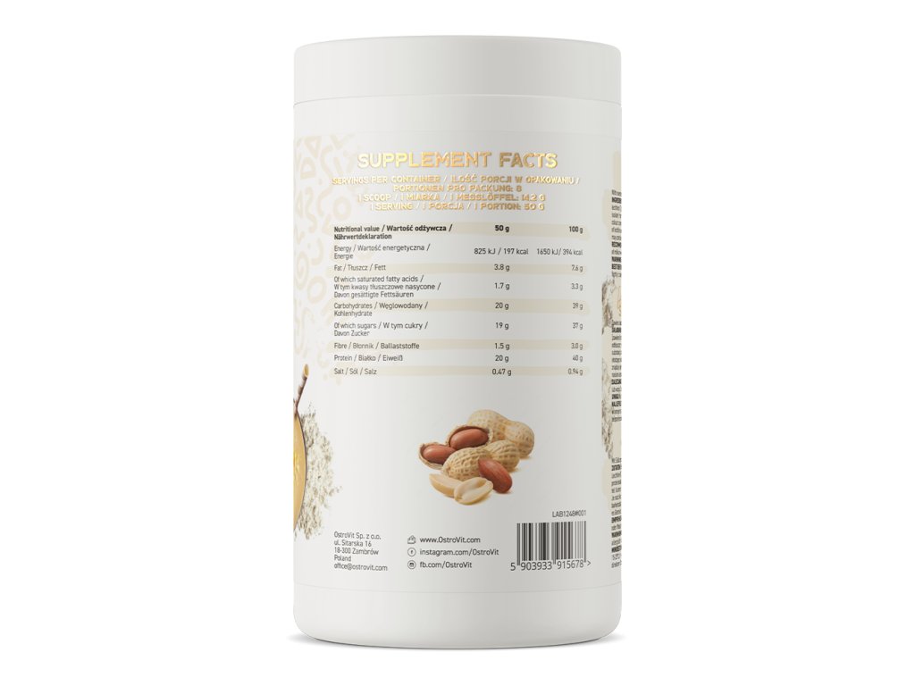 Složení: Sušené podmáslí (z mléka ), koncentrát syrovátkové bílkoviny z mléka [obsahuje lecitiny (1); sójové lecitiny (2)], sušené odstředěné sušené mléko , odstředěné arašídy , syrovátkový izolát z mléka [obsahuje lecitiny (1); sójové lecitiny (2)], zahušťovadlo: xantanová guma; barvivo: čpavkový karamel ; sladidla: sukralóza, acesulfam K.